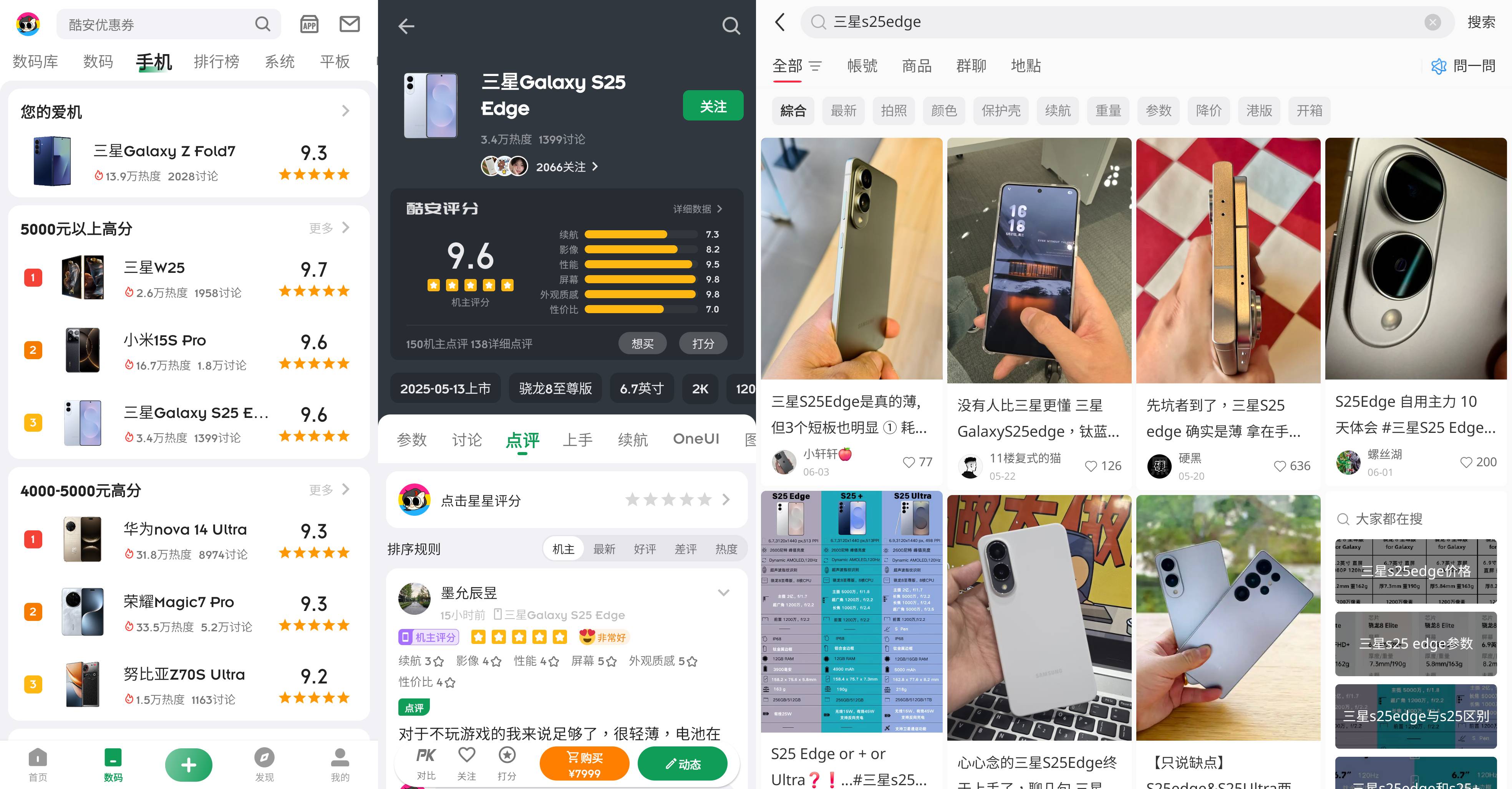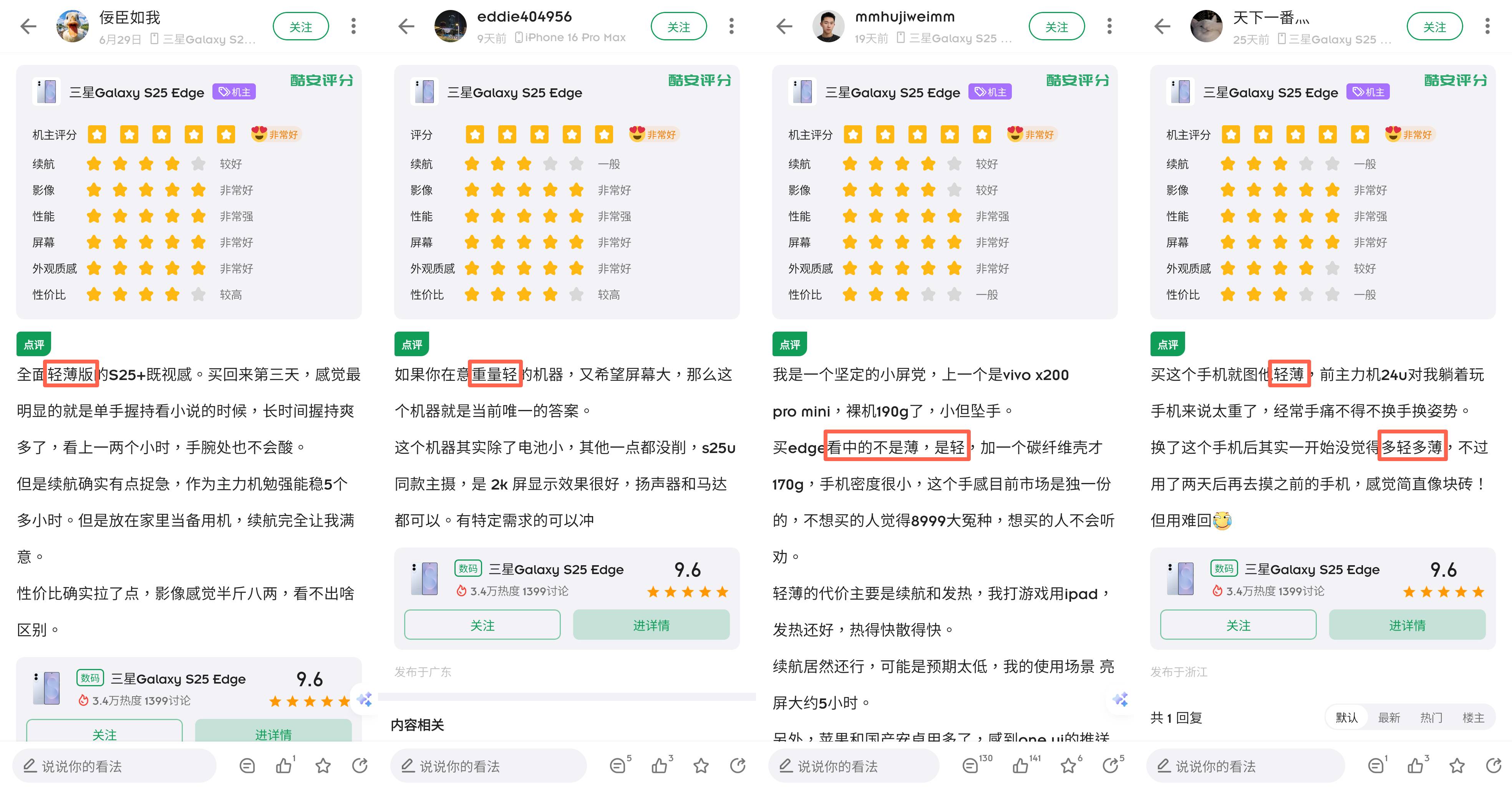酷安几乎每一篇 S25 Edge 的机主评分里,都少不了一个轻字